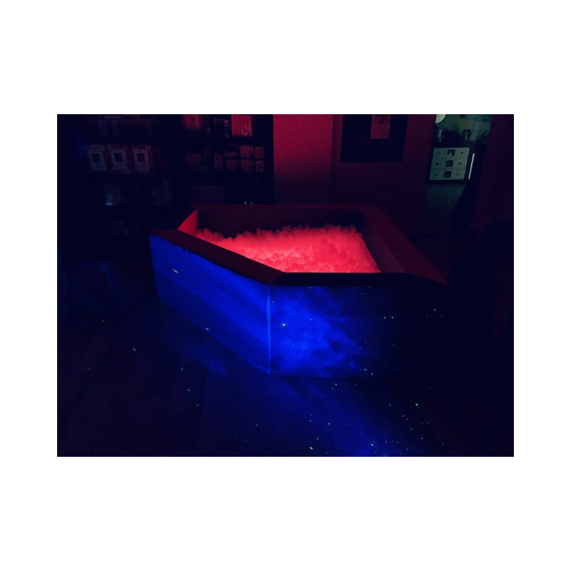 Podłoga basenu wykonana jest z pianki poliuretanowej o grubości 7cm, do której zamontowane są taśmy LED-owe. Taśmy LED zabezpieczone są folią techniczną, która zszyta jest razem z pokrowcem. Nie ma możliwości uszkodzenia oświetlenia podczas zabaw w basenie. LEDy są zabezpieczone przed dziećmi.