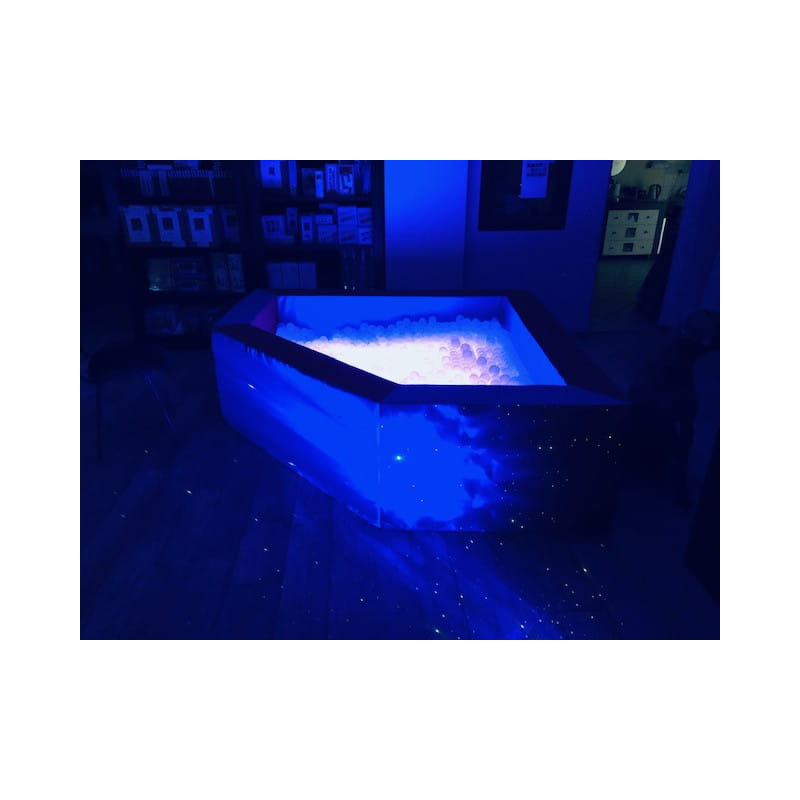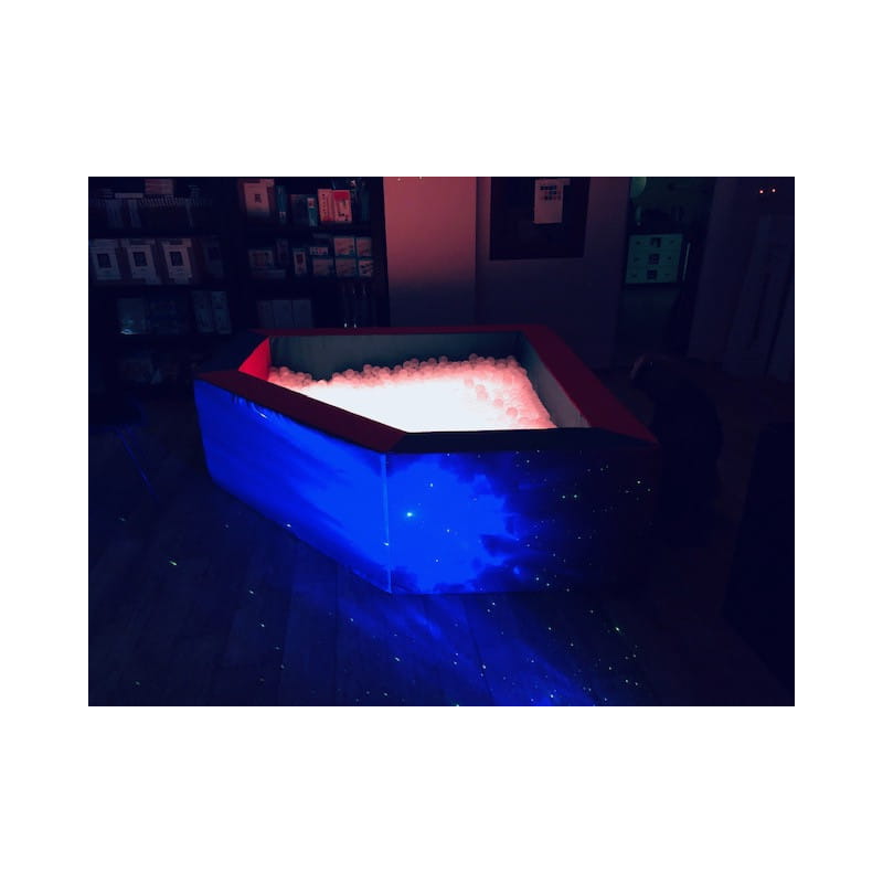 Podłoga basenu wykonana jest z pianki poliuretanowej o grubości 7cm, do której zamontowane są taśmy LED-owe. Taśmy LED zabezpieczone są folią techniczną, która zszyta jest razem z pokrowcem. Nie ma możliwości uszkodzenia oświetlenia podczas zabaw w basenie. LEDy są zabezpieczone przed dziećmi.