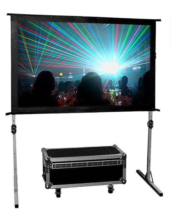 - Wygodna, czarna walizka na kółkach ułatwia transport i przenoszenie ekranu