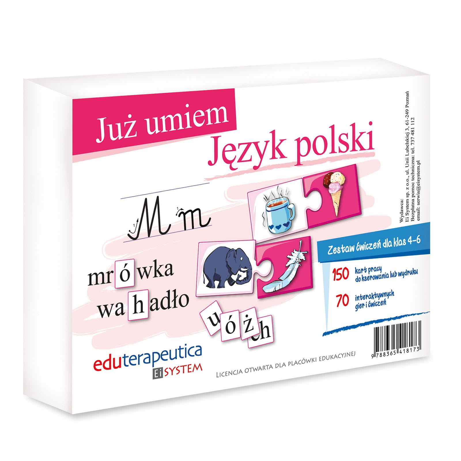 Już Umiem. Język polski to zestaw pomocy dydaktycznej dla nauczycieli języka polskiego klas 4-6 szkoły pozwalający w sposób ciekawy i motywujący uczniów przypominać, rozwijać i poszerzać umiejętności językowe, a w szczególności umiejętności czytania oraz czytelnego i poprawnego pisania . Zestaw może być wykorzystywany na lekcjach języka polskiego, podczas dodatkowych zajęć z uczniami przejawiającymi problemy ze sprawnym czytaniem lub czytelnym i poprawnym pisaniem oraz w ramach edukacji włączającej skierowanej do uczniów z niektórymi deficytami rozwoju psychospołecznego i fizycznego.