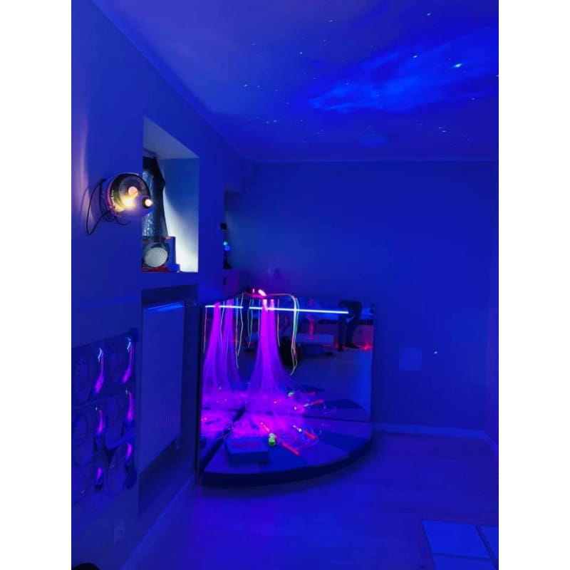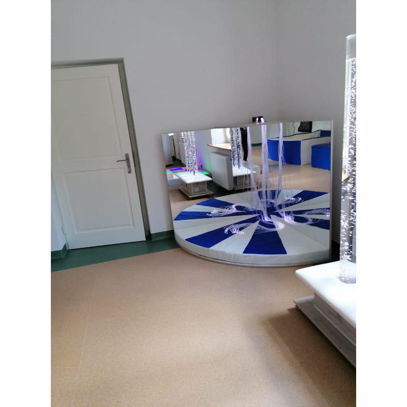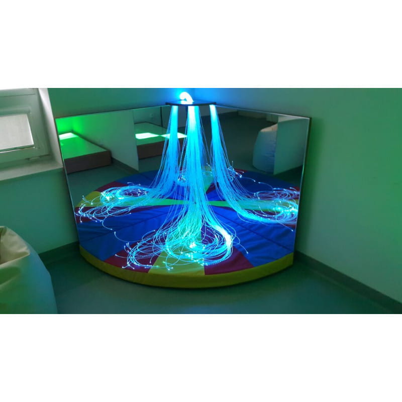 Wyłożony jest lustrami po bocznych ścianach. Lustra te są zupełnie bezpieczne, odporne na ewentualne uderzenia (zamiast lustra szklanego stosuje się akrylowe). Osoba znajdująca się w kąciku , skupia uwagę na samym sobie. Kącik lustrzany podobnie jak wyspa światłowodowa składa się z dwóch luster ustawionych prostopadle do siebie. W kąciku została poprowadzona również instalacja elektryczna ( 2 gniazda z 2 wyłącznikami ). Bez problemu podłączymy do niego urządzenia się martwiąc się brakiem gniazdek w sali.