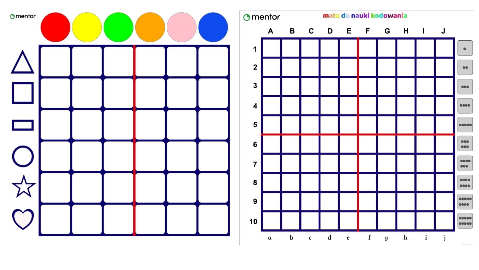- osie na macie oznaczone są za pomocą kolorów i kształtów - mata Kodowanie Junior
