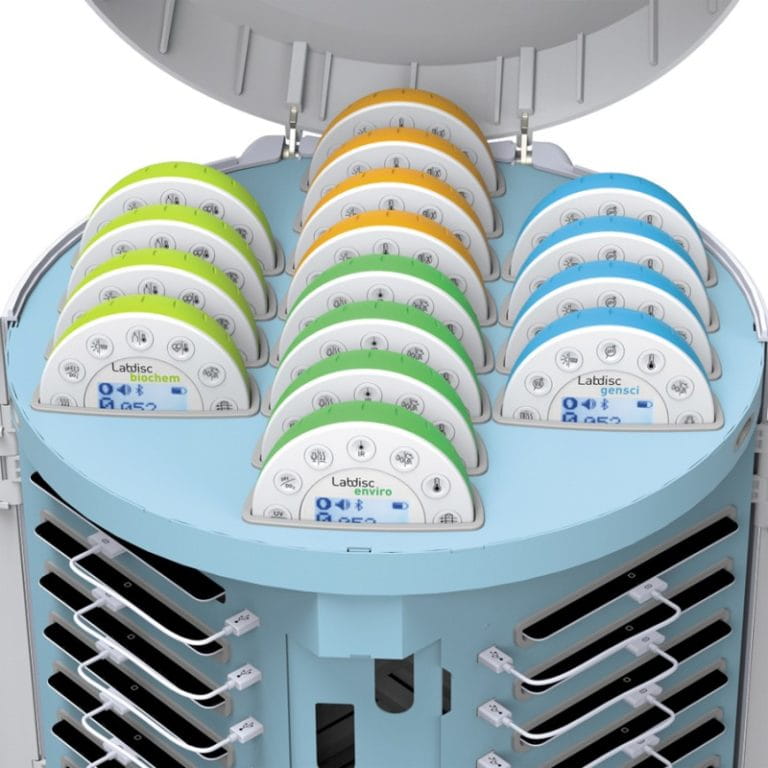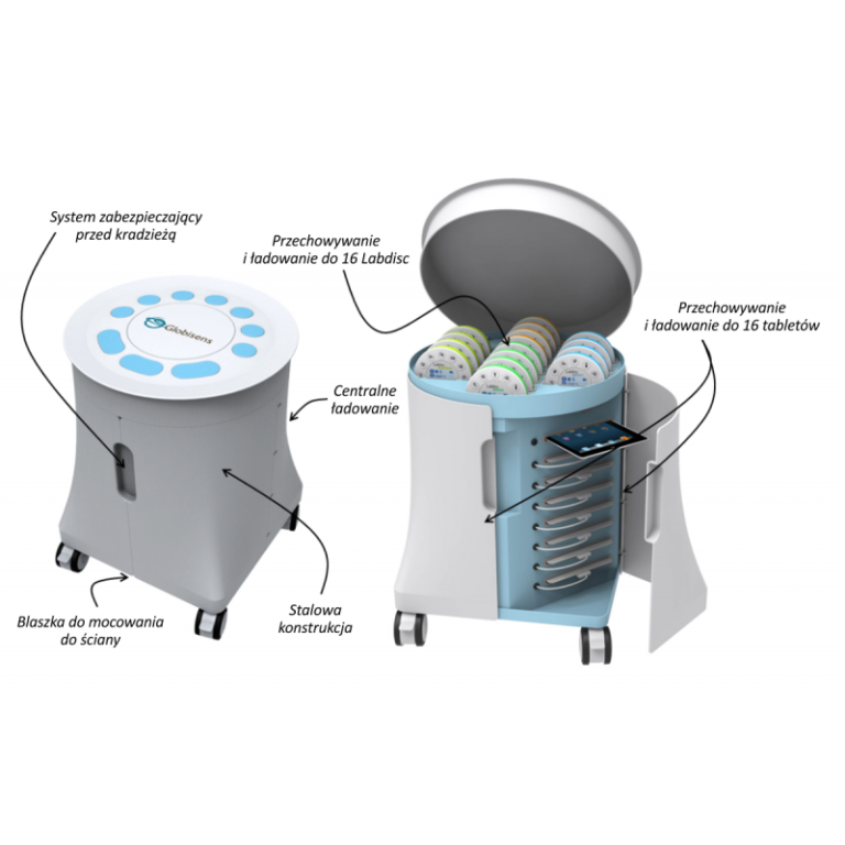 służąca do jednoczesnego przechowywania i ładowania 16 dysków pomiarowych (Biochem, Uniwersalny, Fizyka) oraz 16 tabletów (10″). Dzięki temu rozwiązaniu po zakończeniu zajęć można naładować wszystkie dyski oraz tablety bez niepotrzebnej plątaniny zasilaczy i kabli. Szafka wyposażona jest również w kółka dzięki czemu wygodnie można przejechać z całą zawartością z jednej sali lekcyjnej do drugiej. Część przeznaczona na tablety zamykana jest na klucz. Producent przewidział również miejsce do przechowywania zewnętrznych sond i czujników.