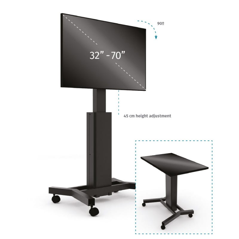 Podstawa mobilna z regulacją wysokości do monitora typu 2w1, umożliwia regulację kąta pochylenia monitora tak by monitor pracował w trybie stołu interaktywnego. Podstawa współpracuje z monitorami od 32 do 70 cali, o wadze maksymalnej do 85 kg. Dzięki mobilnej konstrukcji podstawy w łatwy sposób możemy przemieszczać zamontowany monitor interaktywny między salami. Podstawa umożliwia regulację wysokości monitora w zakresie do 450 mm. Kółka podstawy zostały wyposażone w blokady, dodatkowo pilot zdalnego sterowania wyposażono w przycisk bezpieczeństwa blokujący wysokość.