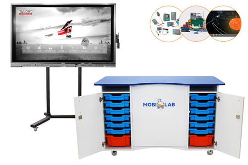 Nasze mobilne laboratorium mobiLab to wielofunkcyjne centrum dydaktyczne do przeprowadzania eksperymentów z chemii, biologii, fizyki i geografii. To nowoczesne, dopasowane do potrzeb programowych minilaboratorium wyposażone w mobilną szafkę do prezentacji i przeprowadzania doświadczeń oraz monitor interaktywny na statywie jezdnym. To doskonała baza do pracowni przyrodniczych, który umożliwia nauczycielowi dostosowanie jej do potrzeb tematycznych, a także dowolną konfigurację pod konkretny przedmiot.