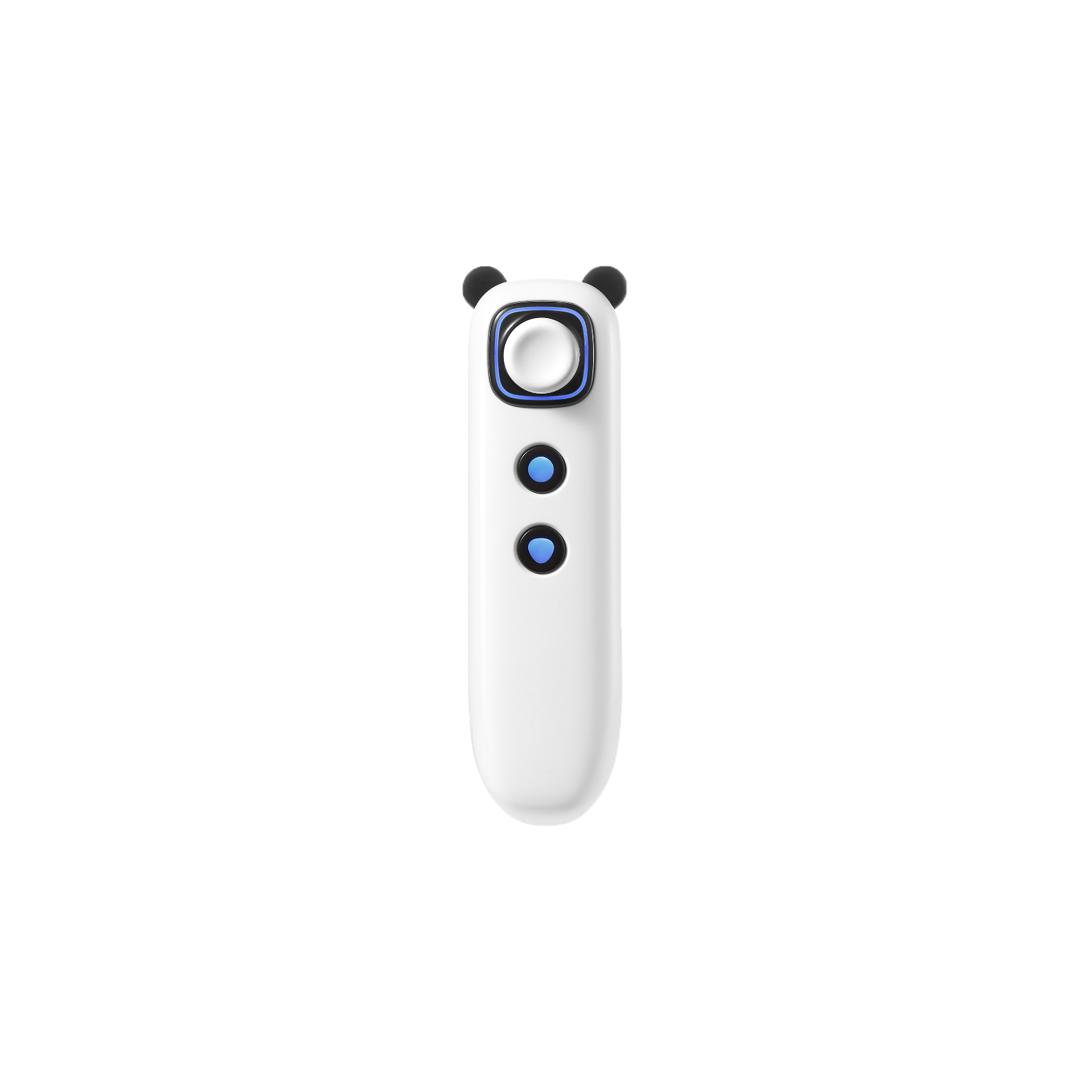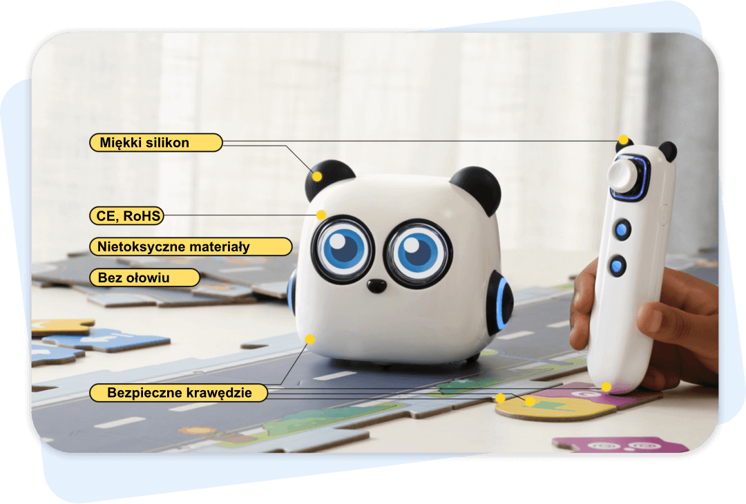 Mały uroczy robot w kształcie pandy ma wbudowane sensory, porusza się i reaguje na polecenia. Jest przyjazny dla dzieci i zaprojektowany w taki sposób, aby przyciągać ich uwagę.