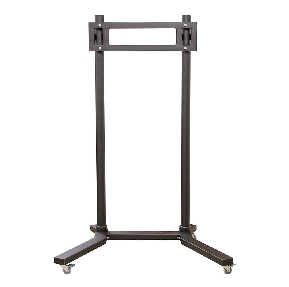 Mobilny, uniwersalny dwusłupowy statyw na podstawie jezdnej do monitora interaktywnego.