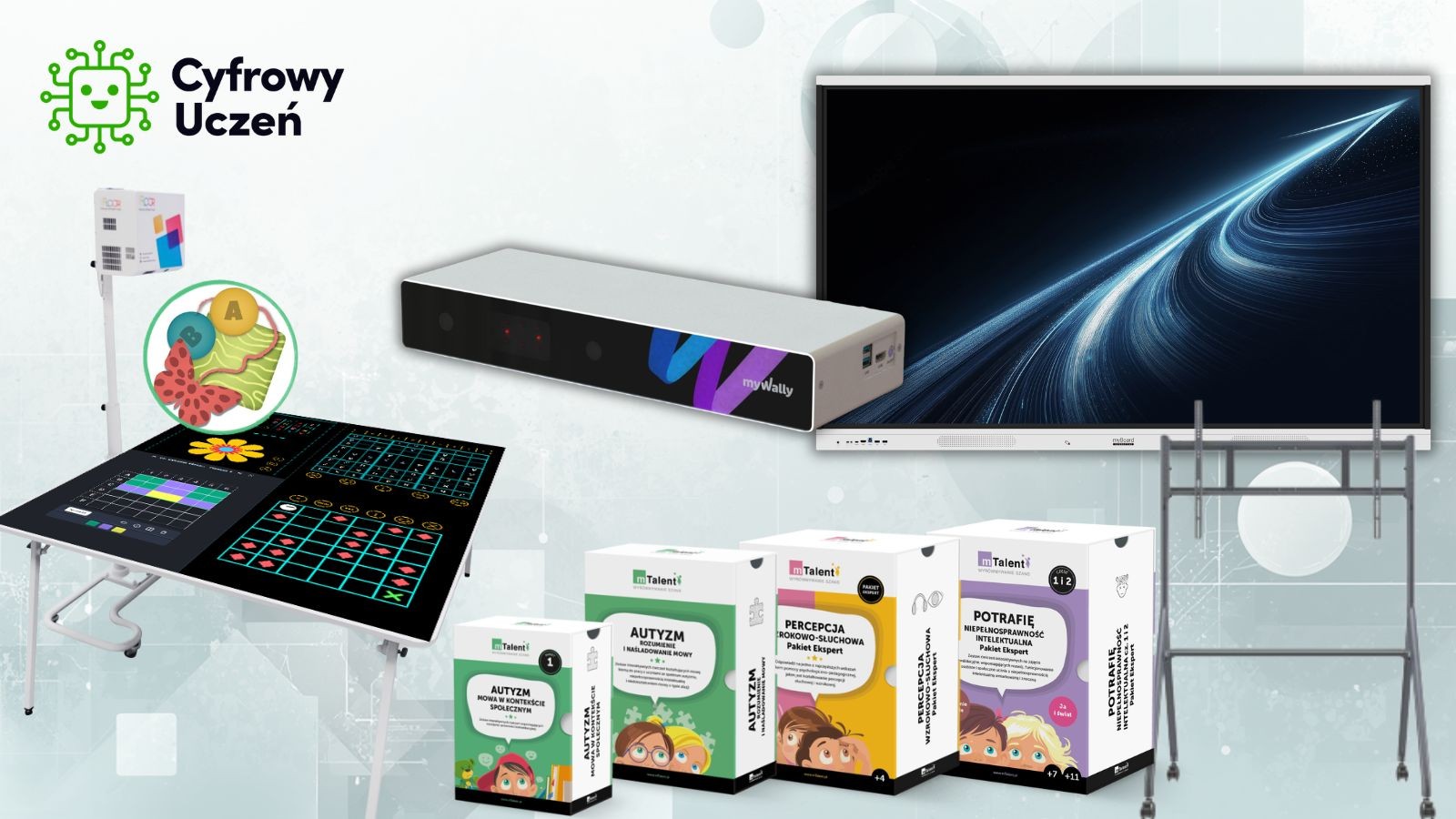 Centralnym elementem zestawu jest jednostka centralna myWally wraz z oprogramowaniem edukacyjno-rewalidacyjnym, która wprowadza do zajęć element ruchu i aktywności fizycznej. Dzięki temu uczniowie uczą się poprzez działanie, co wspiera koncentrację, koordynację oraz zaangażowanie.