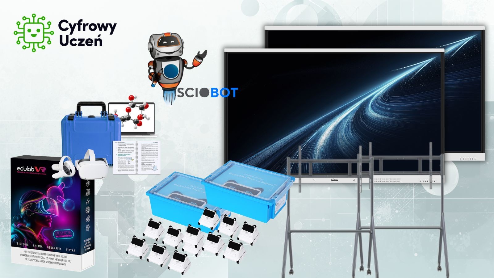 Zestaw 32 (R) - Interaktywna pracownia VR to rozbudowane rozwiązanie edukacyjne, które łączy technologię wirtualnej rzeczywistości, robotykę oraz nowoczesne narzędzia do prowadzenia zajęć angażujących uczniów. Zestaw został przygotowany zgodnie z założeniami programu Cyfrowy Uczeń, wspierając rozwój kompetencji cyfrowych, analitycznych oraz umiejętności pracy zespołowej.