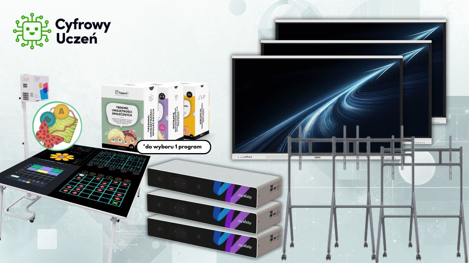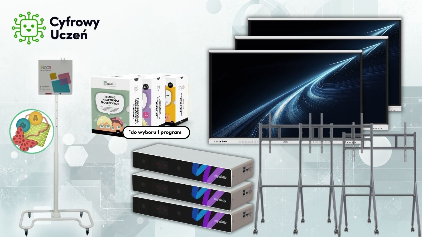 Zestaw oparty jest na trzech monitorach interaktywnych myBoard White Arrow 75'' UHD 4K z Androidem 14, które umożliwiają prowadzenie kilku zajęć jednocześnie, pracę w małych grupach oraz indywidualne podejście do ucznia. Dzięki mobilnym statywom możliwe jest łatwe dostosowanie przestrzeni do różnych form terapii.