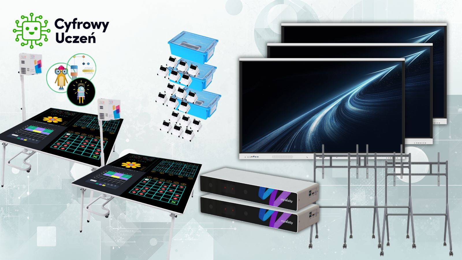 Zestaw oparty jest na trzech monitorach interaktywnych myBoard White Arrow 75'' UHD 4K z Androidem 14, które stanowią centrum zarządzania każdą ze stref. Umożliwiają prezentację treści, pracę zespołową oraz prowadzenie zajęć w różnych układach dydaktycznych. Dzięki mobilnym statywom możliwa jest szybka reorganizacja przestrzeni.